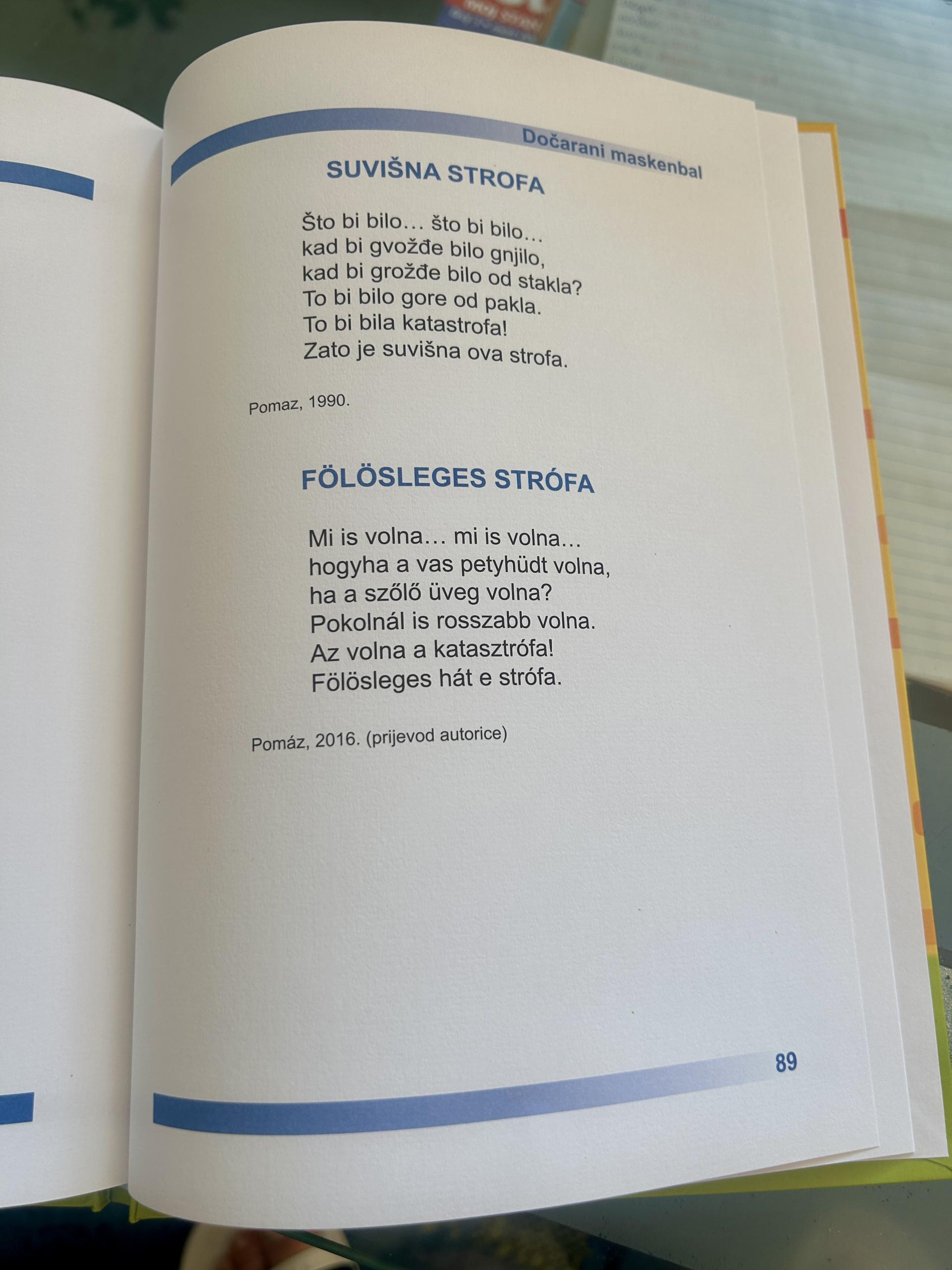 Poseban dio zbirke čine dvojezični stihovi – prijevodi mađarskih pjesnika (poput Sándora Weöresa) na hrvatski, te hrvatskih pjesama (među njima i Grigora Viteza) na mađarski, što odražava autoričinu duboku povezanost s oba jezika i njezin rad u dvojezičnoj zajednici.