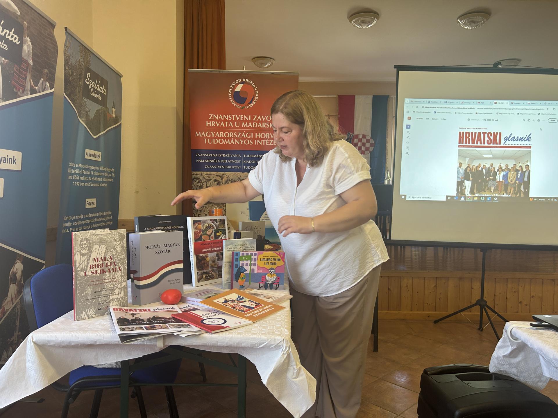 U nakladničkom dijelu osvrnula se na nova izdanja Croatice, među kojima posebno mjesto zauzima dvojezična knjiga Josipa Mihovića Bezbroj nijansi plavetnila / A kék megannyi változata – te ilustrirana priča Kralj Tomislav i njegovo zlatno prijestolje, izdana u povodu 1100. obljetnice krunidbe prvog hrvatskog kralja, namijenjena mladim čitateljima i školama s ciljem poticanja povijesne svijesti. Posebno je istaknula vaľnost kontinuiranog objavljivanja sadrľaja na hrvatskom jeziku kao temelj očuvanja identiteta zajednice.